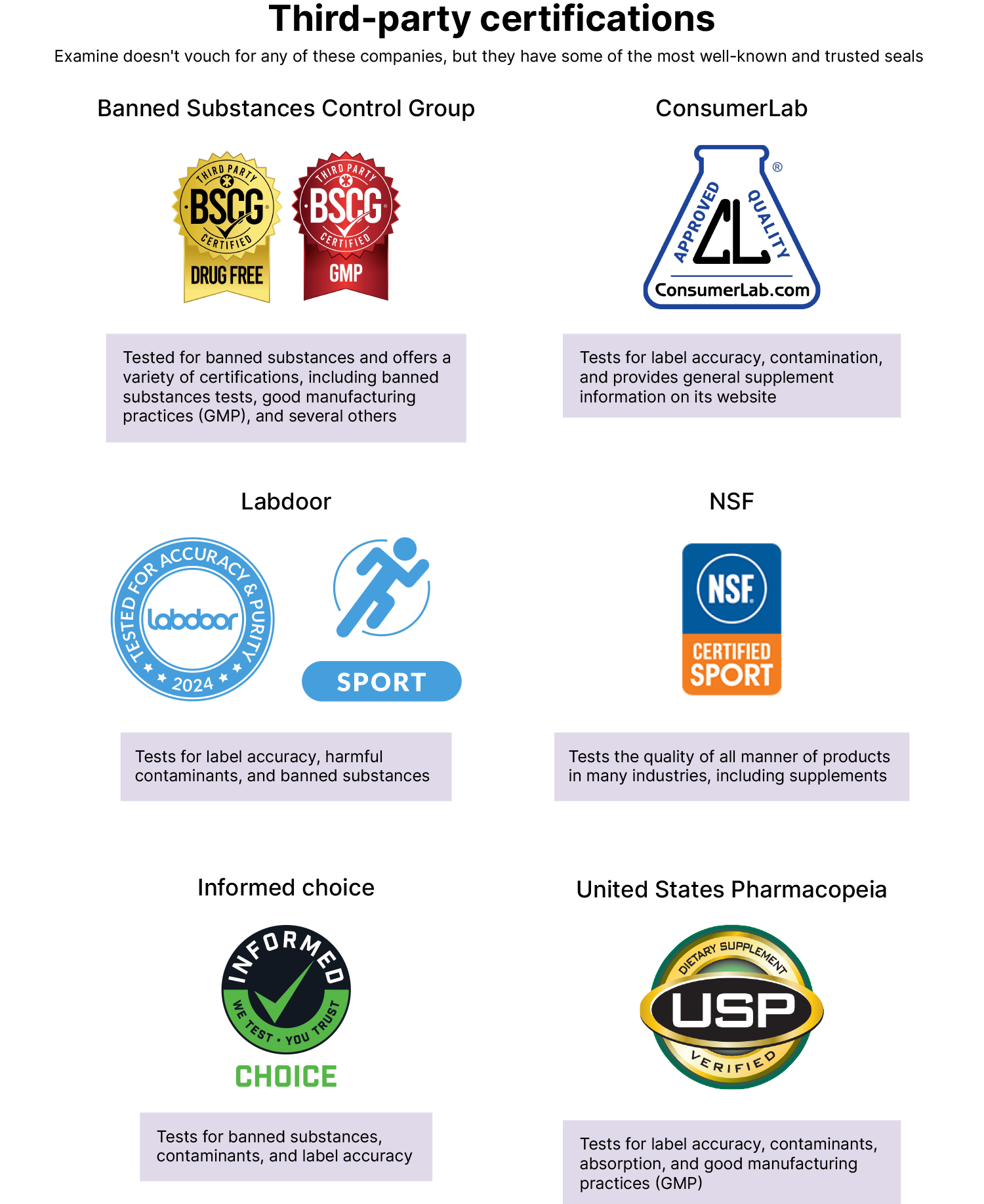 - Some private companies have their own seals, which can be displayed by the products that have passed their tests. Banned Substances Control Group, ConsumerLab, Informed Choice, Labdoor, NSF International, and United States Pharmacopeia are among the better-known companies — we don’t promote any of them, however, and cannot speak for their testing protocols.