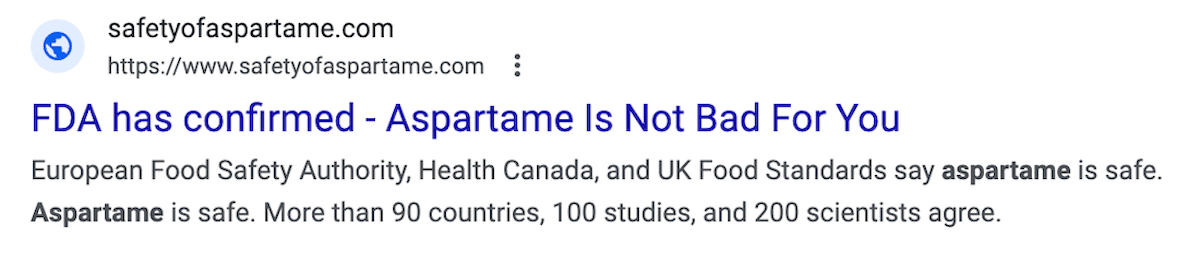 Millions of people immediately Googled to find out if aspartame was actually dangerous, and millions of people came away (rightfully) confused. I mean, just check out the first sponsored search result when I googled “aspartame who”: