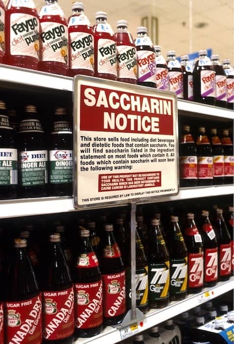 Anyway: A bunch of diet sodas used to use saccharin, but switched to other sweeteners in the 1980s because the FDA warned of animal research linking it to cancer. Here’s some visual evidence:
