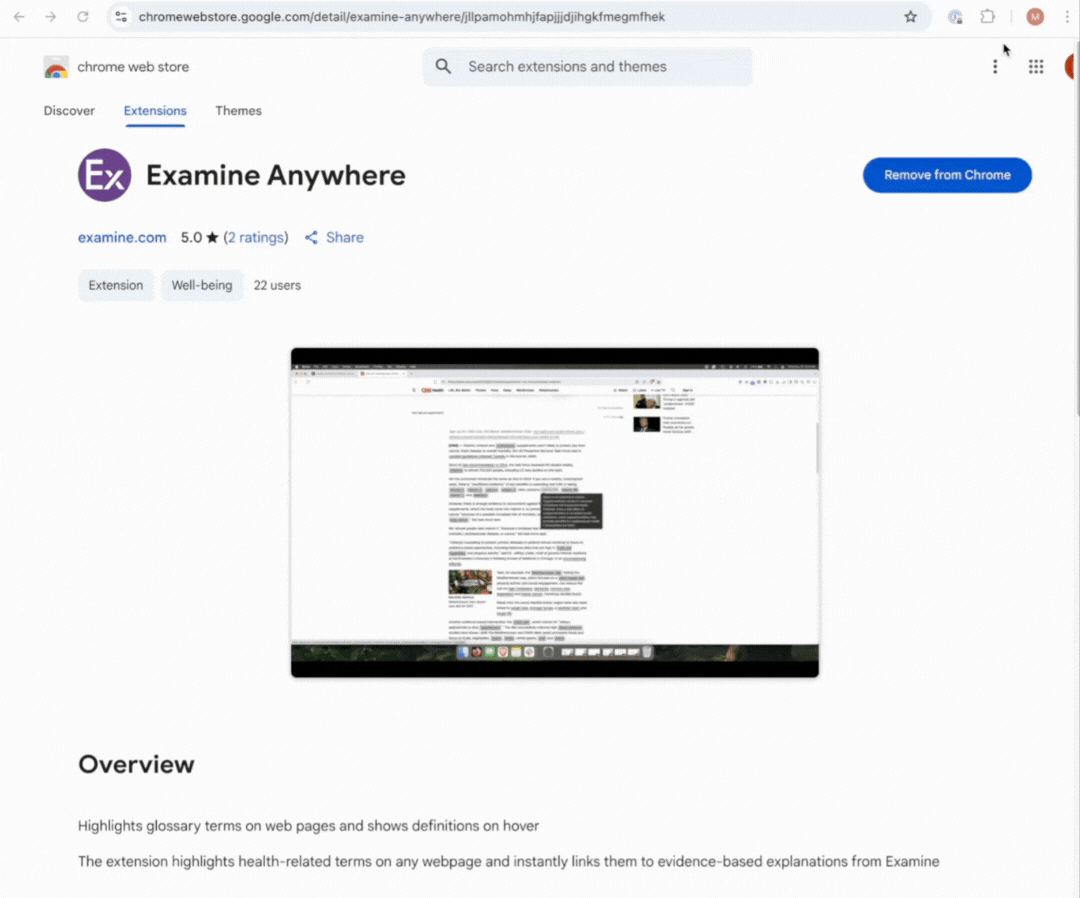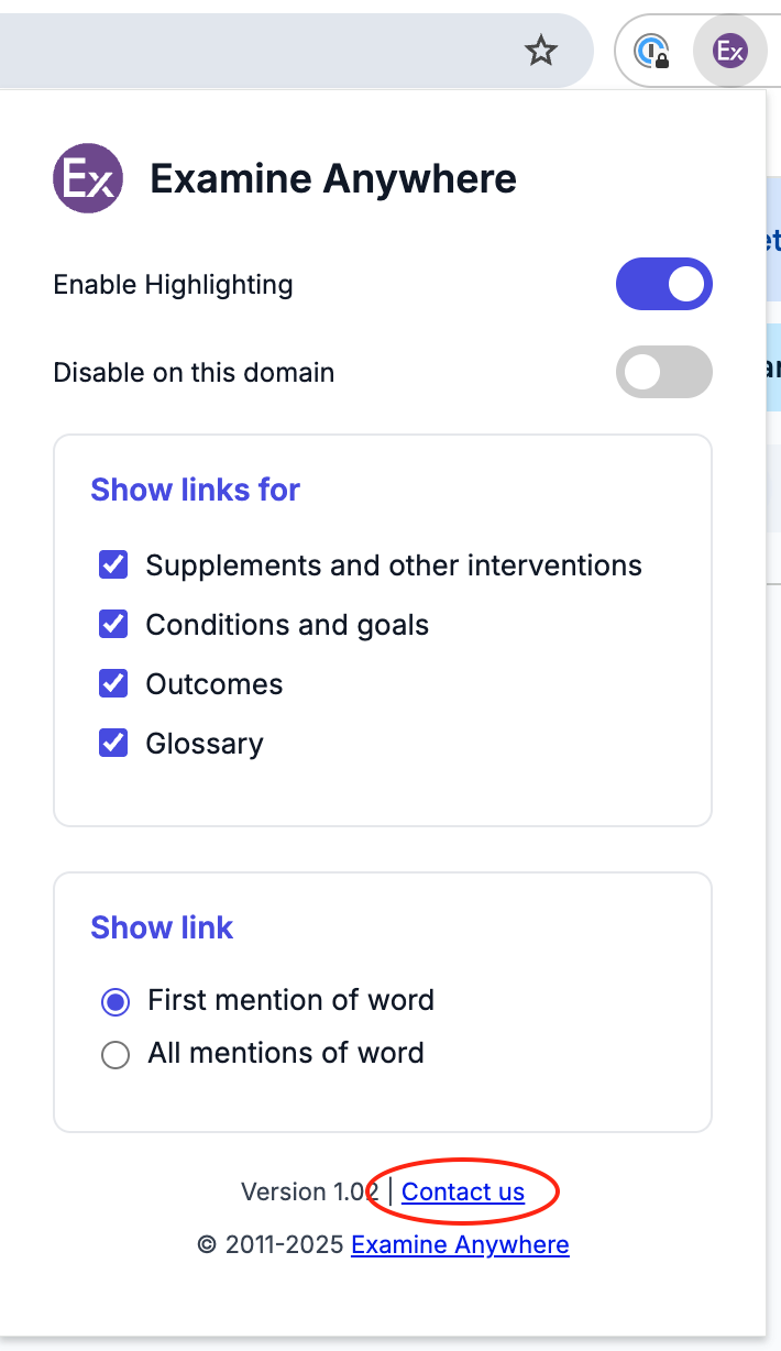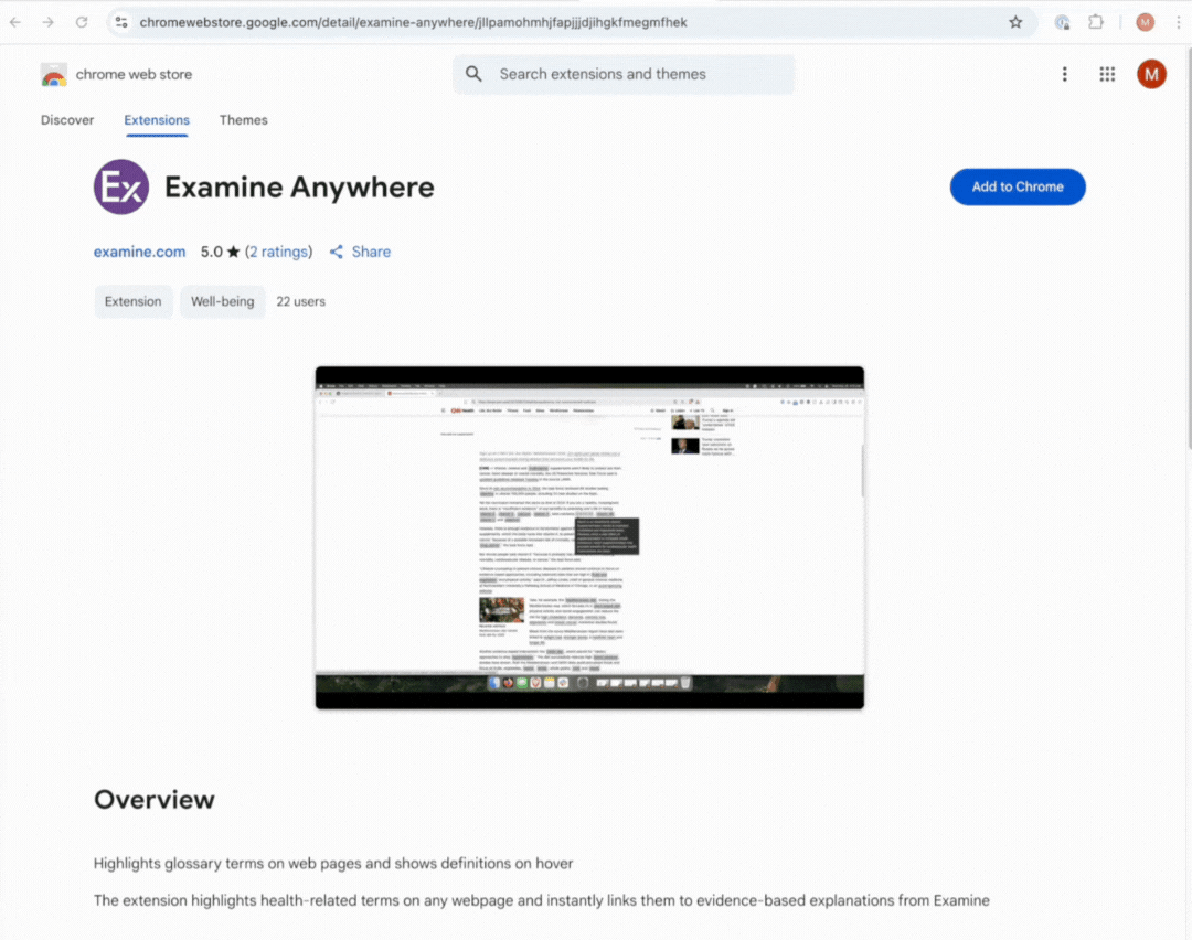 - 🔍 Instant insights as you browse: Visit any page in your browser and automatically highlight terms like creatine, berberine, or LDL. Hover to get a quick summary. The extension automatically converts detected terms with pages on Examine into direct links. Click on the direct links to get Examine’s full evidence and analysis.
