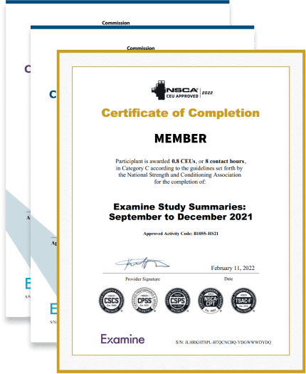 Each month, at no extra cost, Examine+ members can read a selection of summaries and answer a quiz to earn CPEUs and CEUs from some of the top health organizations: the Academy of Nutrition and Dietetics (AND), the National Academy of Sports Medicine (NASM), the National Strength and Conditioning Association (NSCA), and more to come.