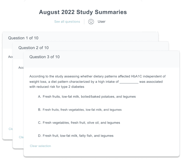 Each month, at no extra cost, Examine+ members can read a selection of summaries and answer a quiz to earn CPEUs and CEUs from some of the top health organizations: the Academy of Nutrition and Dietetics (AND), the National Academy of Sports Medicine (NASM), the National Strength and Conditioning Association (NSCA), and more to come.